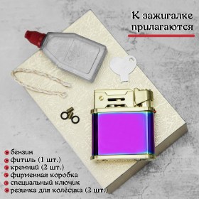 • В комплекте к зажигалке прилагаются: фирменная коробка, бензин в пластиковой ёмкости, фитиль (1 шт.) и кремний (2 шт.), специальный ключик, резинка для колёсика зажигалки (2 шт.);
