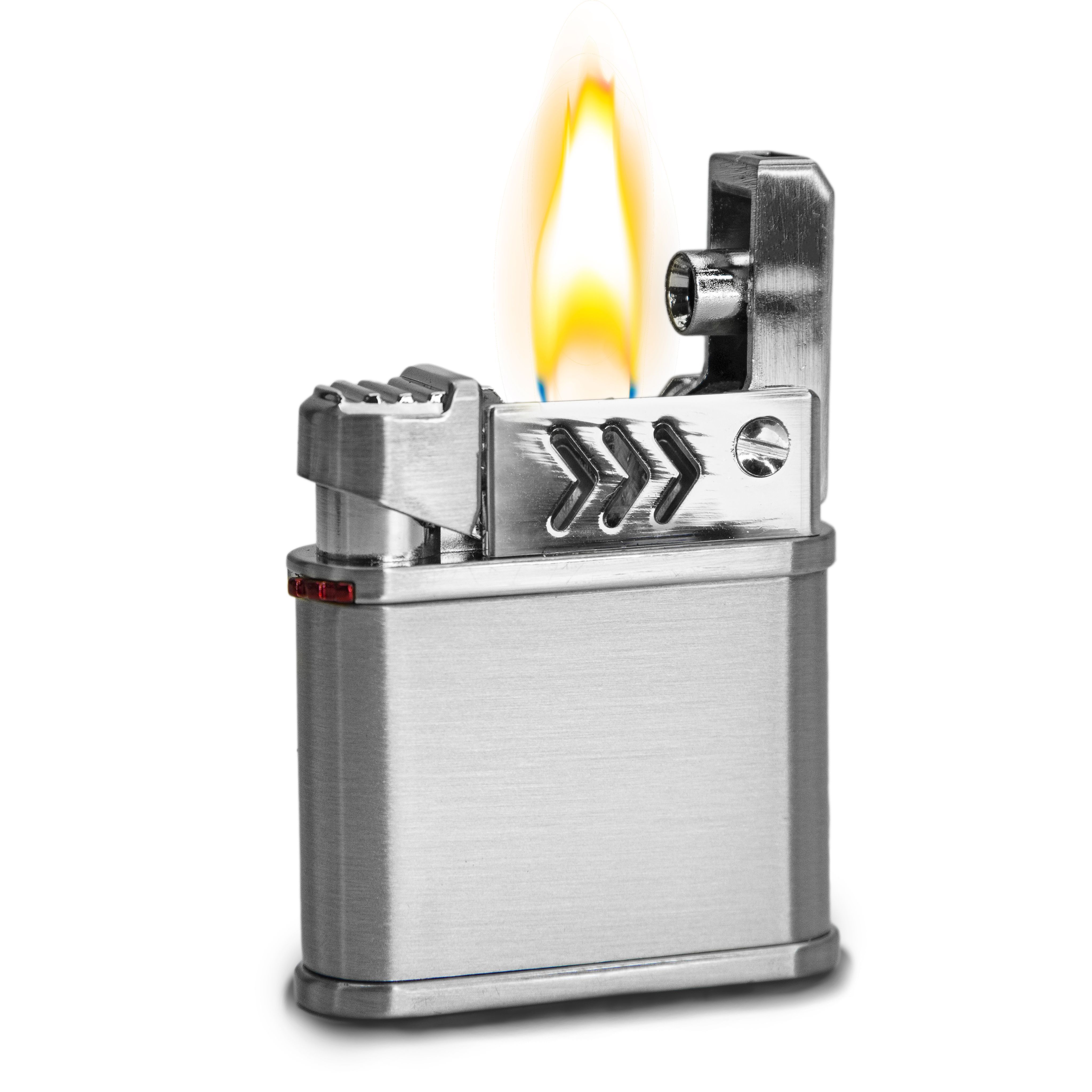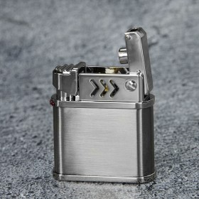 - Механизм работы: специальный замок-колесико сдвигается в сторону, нажимается кнопка. Далее одновременно откидывается крышка зажигалки, высекаются искры и поджигается фитиль;