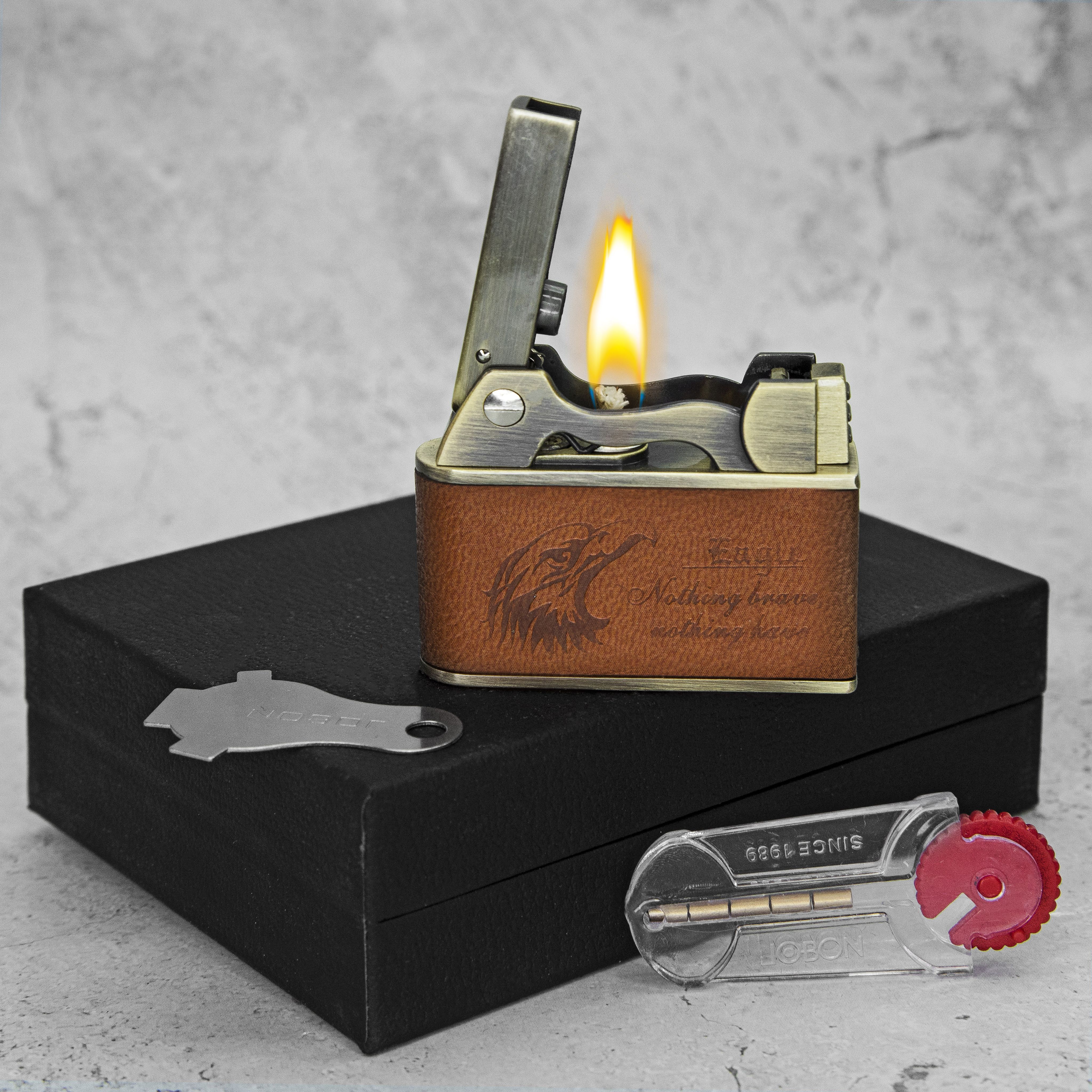 Сверхнадёжная ретро бензиновая зажигалка в очень прочном корпусе. Долго держит пары бензина, не боится ветра и воды. В комплекте идут сменные кремни, ключик-отвалка для отсека с бензином. Зажигалка поставляется не заправленной.