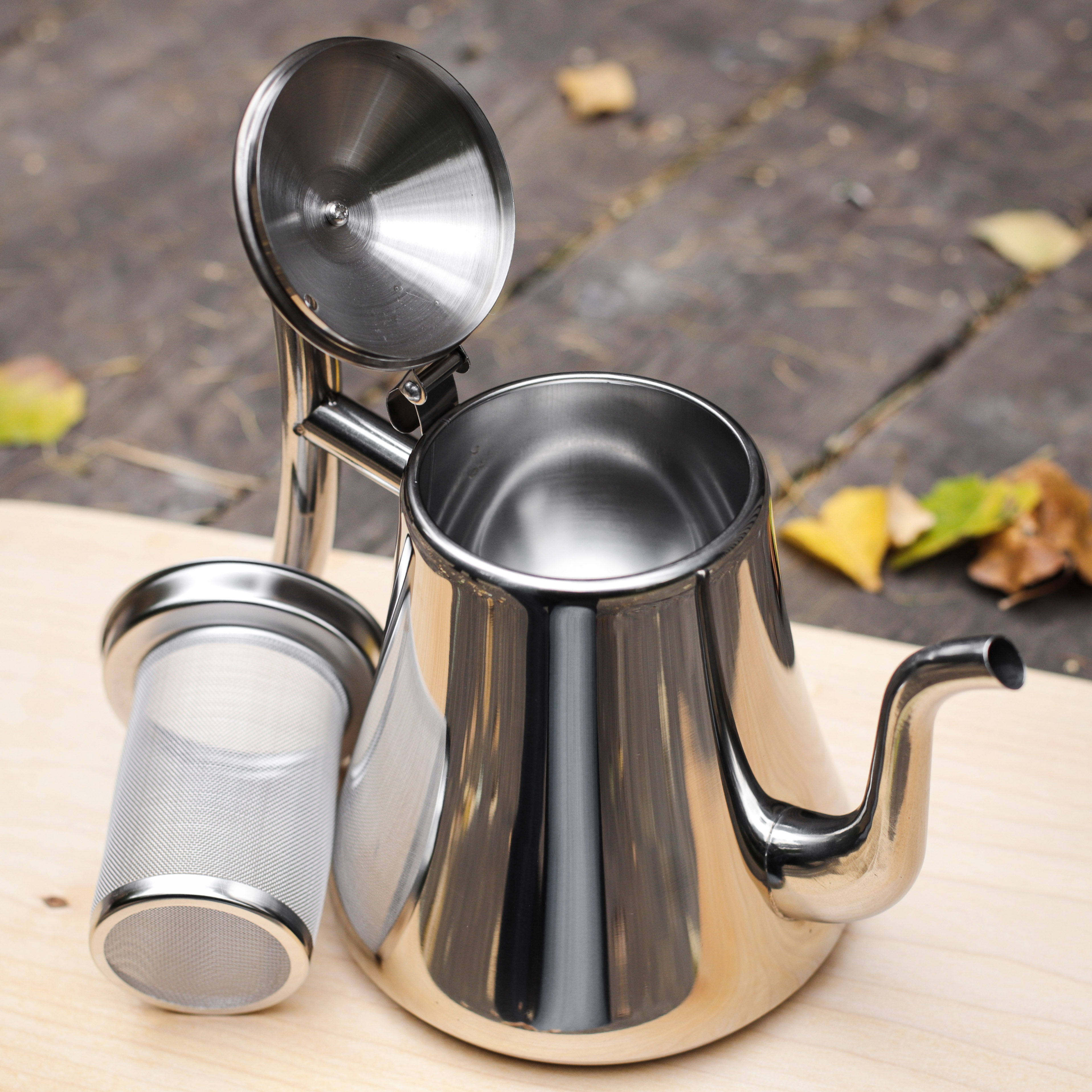 Чайник оснащен съемным фильтром и рычагом для откидной крышки (которая не потеряется). Качественное исполнение и стильное решение для вашей кухни и похода.