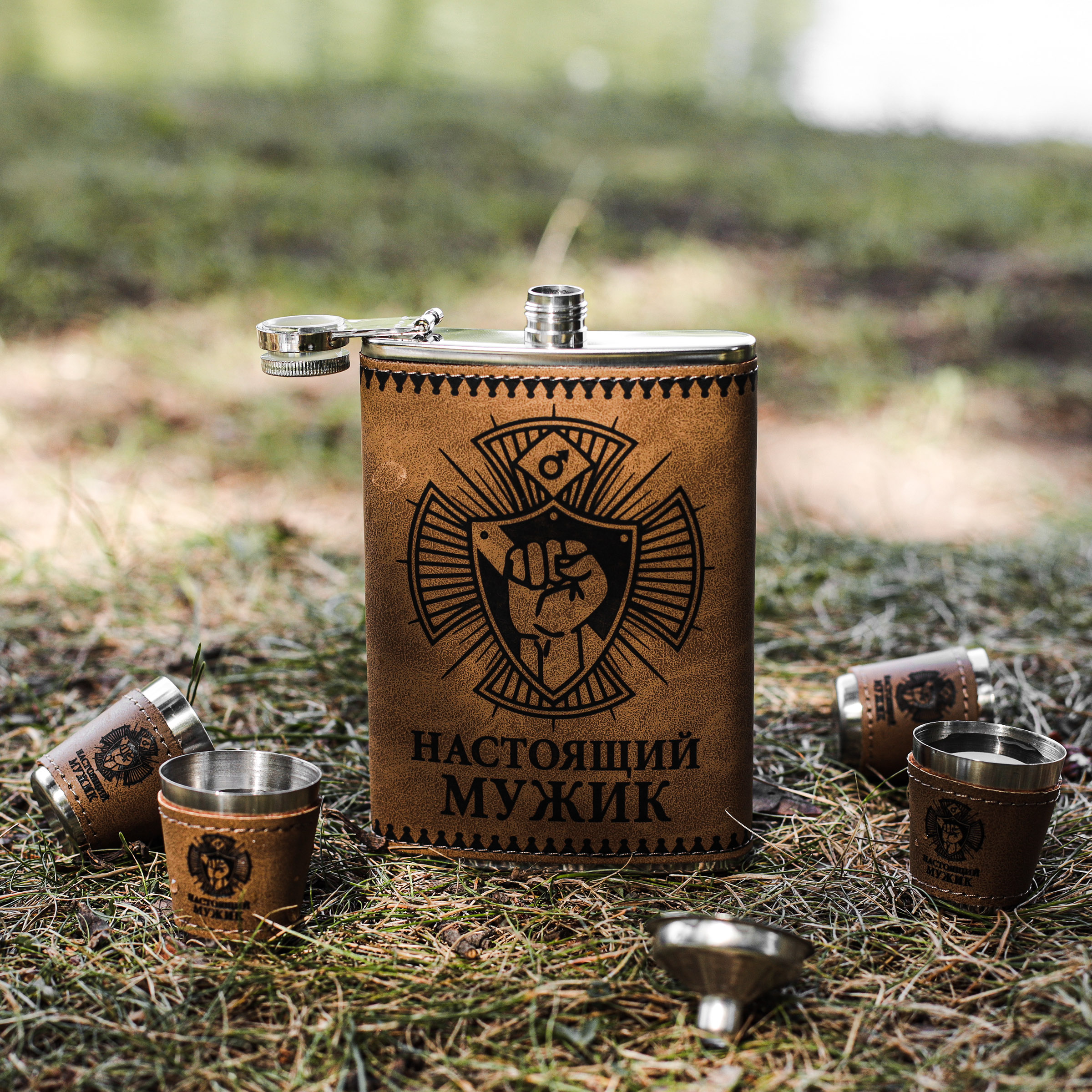 На лицевой стороне фляжки и 4-х стопок, которые обтянуты кофей, нанесена символика "Настоящий мужик". Набор красиво упакован в подарочную коробку.