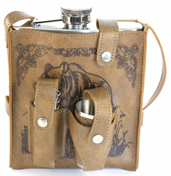 Фляга из нержавейки Россия в кобуре Объем - 18 oz/0,53 л Комплектуется тремя стопками и мультитулом Фиксируется чехлом на ремне, для удобного хранения и использования