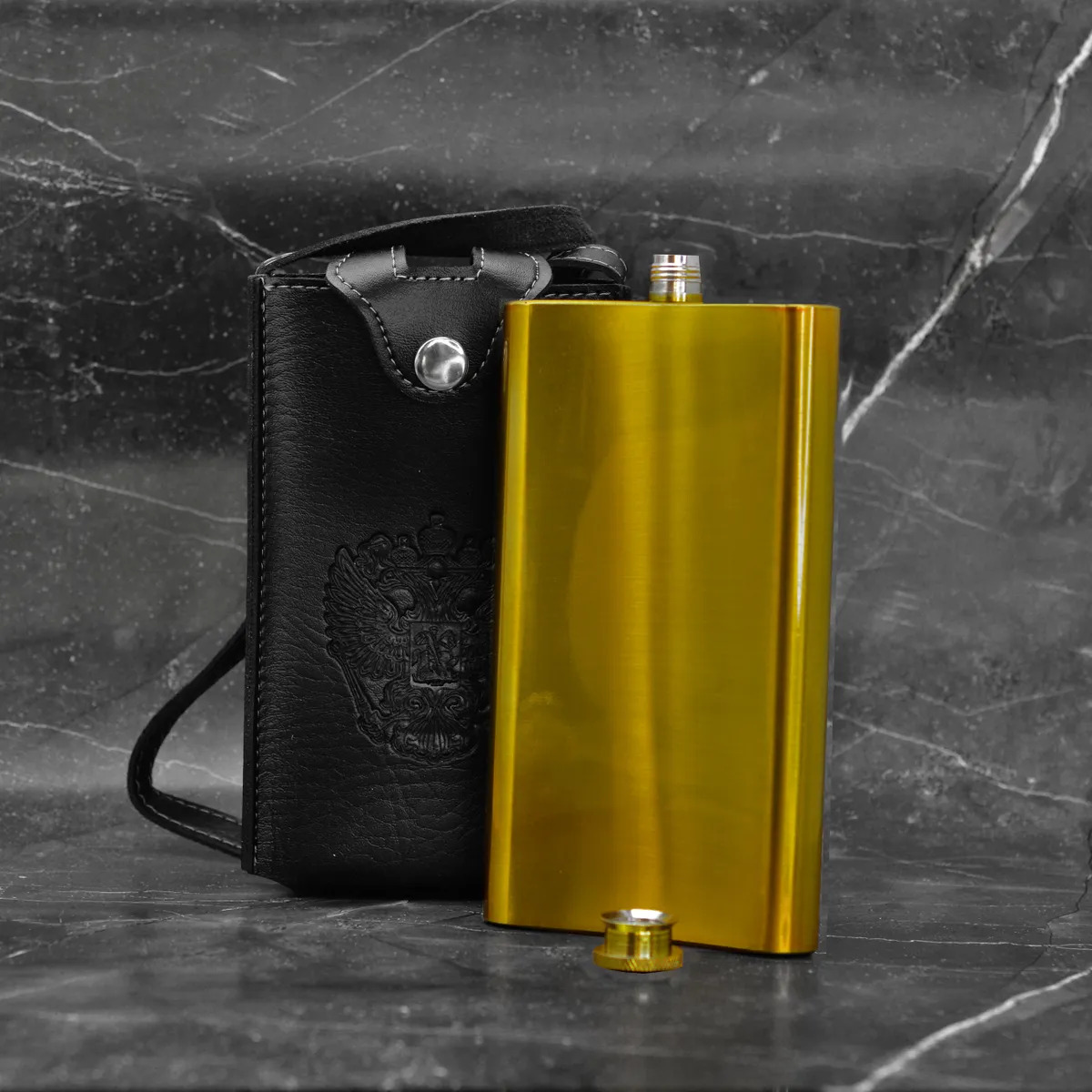 Фляжка в кобуре стальная плоская зеркальная 12 oz (350 мл.) золотой
