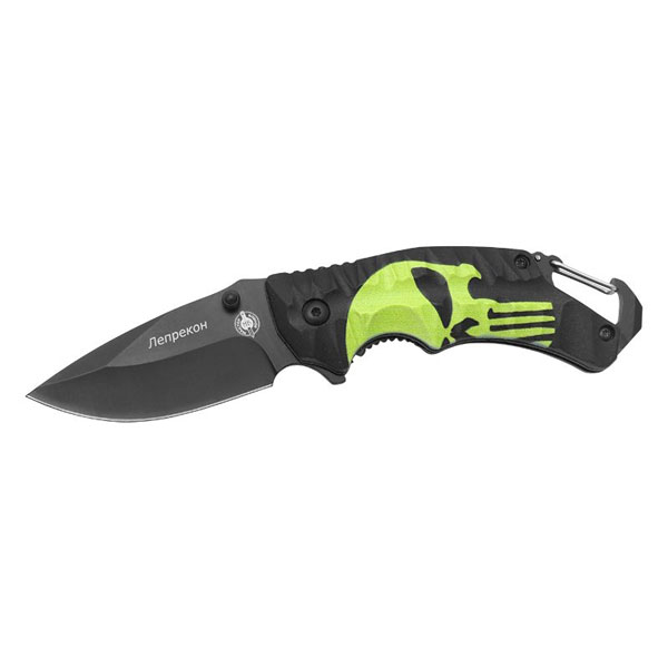 Лепрекон идеально подойдет на роль городского или вспомогательного ножа. Например для железнодорожных путешествий, там, где нужен очень компактный инструмент. Клинок достаточно широкий, с высокими спусками, сделан из качественной нержавеющей стали. Пластиковая рукоять надежна, украшена рисунком стилизованного черепа. Карабин существенно расширяет возможности ношения Лепрекона. Нож легко открывается одной рукой с помощью двустороннего шпенька.
