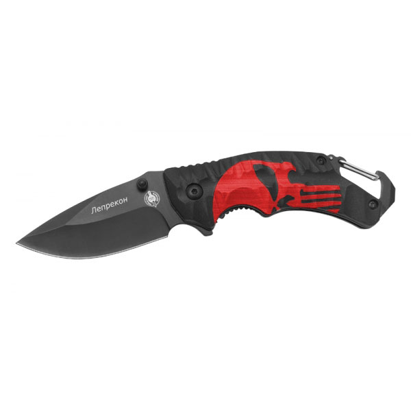 Лепрекон идеально подойдет на роль городского или вспомогательного ножа. Например для железнодорожных путешествий, там, где нужен очень компактный инструмент. Клинок достаточно широкий, с высокими спусками, сделан из качественной нержавеющей стали. Пластиковая рукоять надежна, украшена рисунком стилизованного черепа. Карабин существенно расширяет возможности ношения Лепрекона. Нож легко открывается одной рукой с помощью двустороннего шпенька.