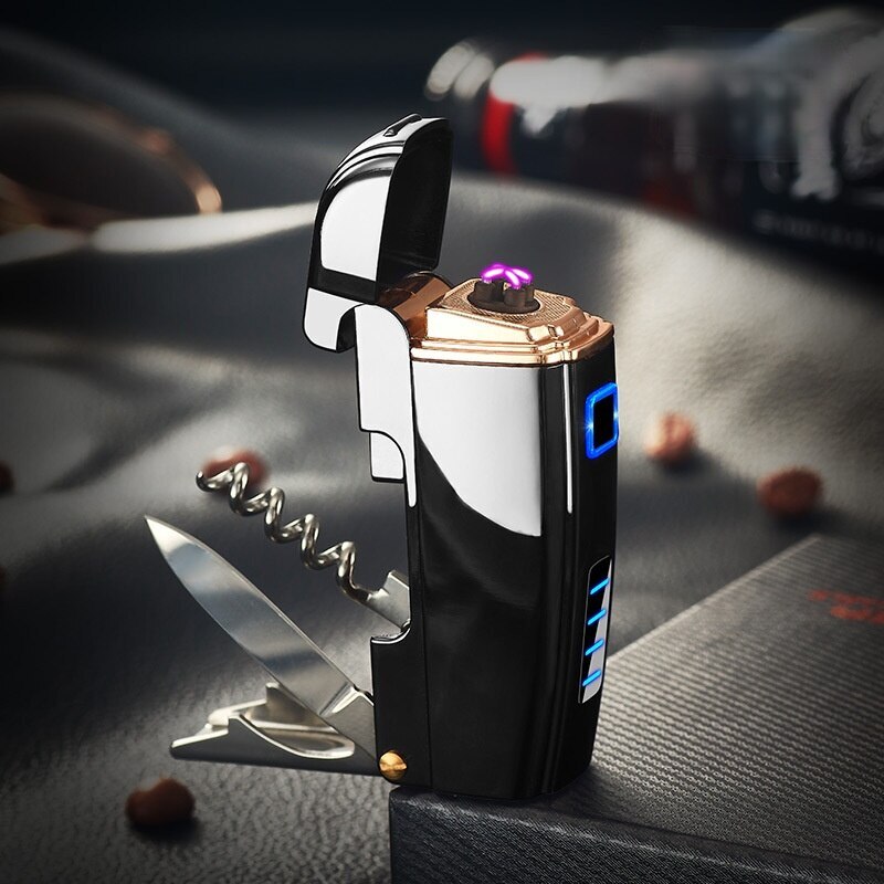 Импульсная USB зажигалка две дуги - мультитул, нож, штопор, открывалка, черная