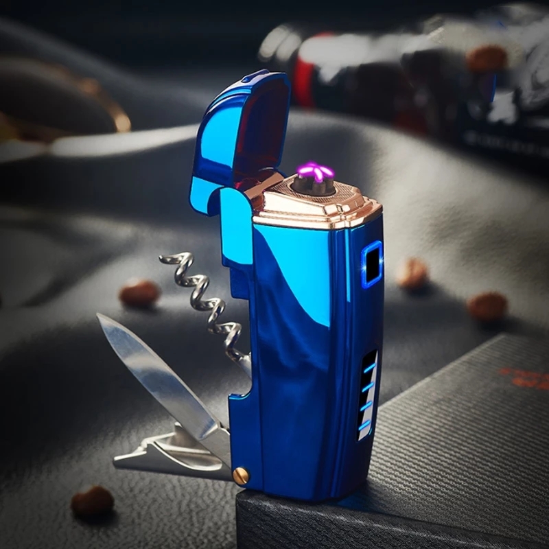 Импульсная USB зажигалка две дуги - мультитул, нож, штопор, открывалка, синяя