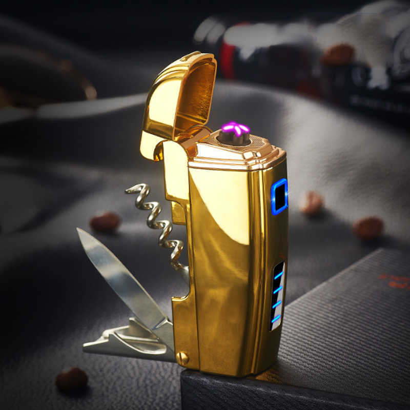 Импульсная USB зажигалка две дуги - мультитул, нож, штопор, открывалка, золотая