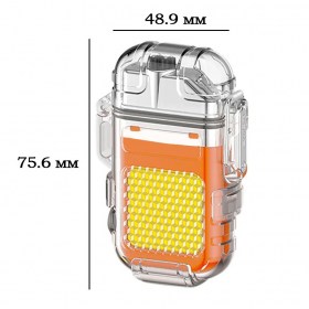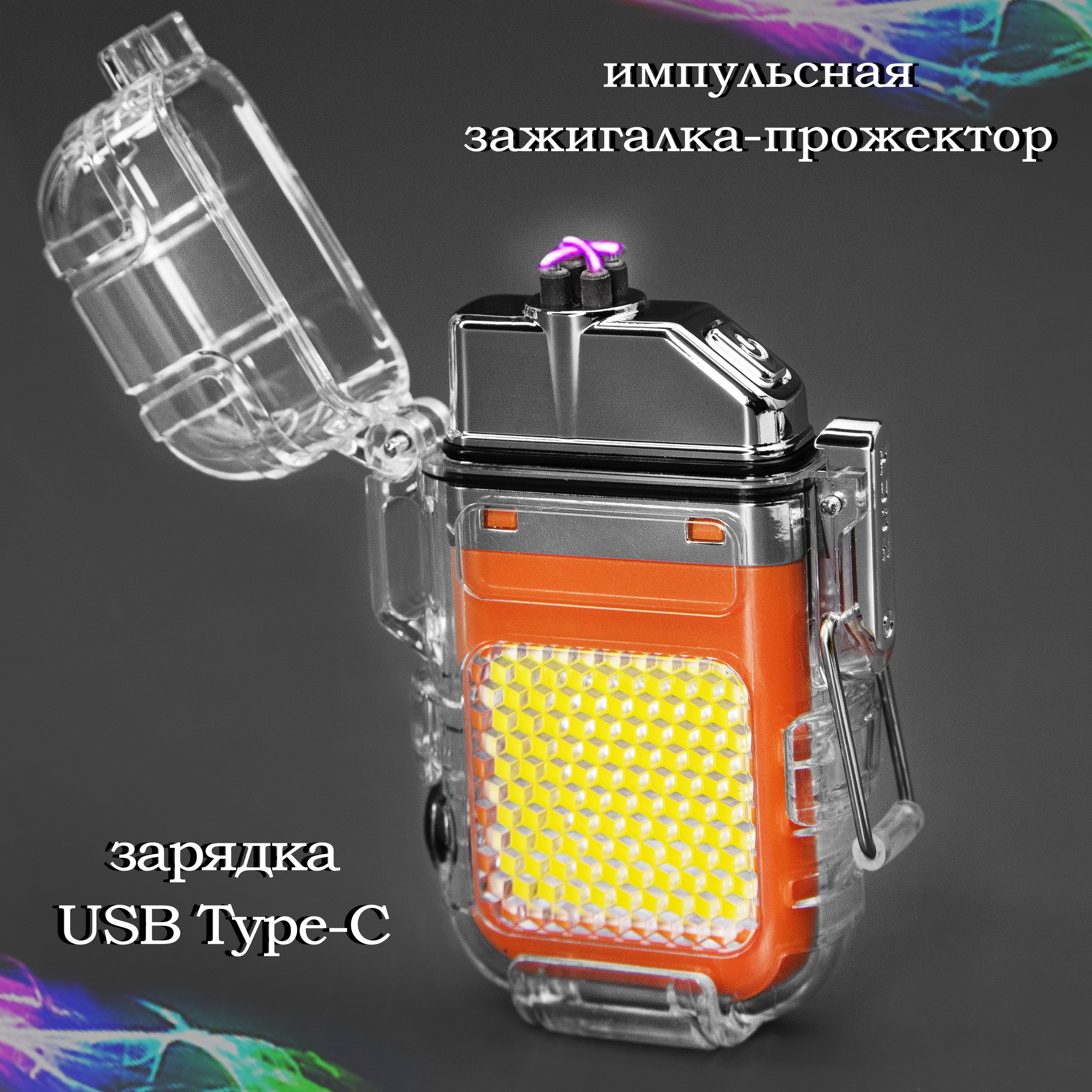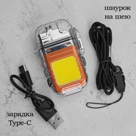 Импульсная зажигалка-прожектор COB-10W в пыле-водонепроницаемом боксе IPX7 / Сталь, зарядка Type-C, клипса на снаряжение или амуницию / Оранжевая