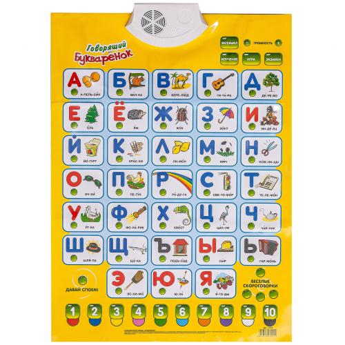 Многим детям понравится обучающая игра Говорящий Букваренок, ведь она имеет несколько разных режимов: изучение, экзамен, игра, давай споем. Плакат работает с помощью батареек имеет влагостойкую поверхность и сенсорные кнопки. Обучающая и развивающая игрушка поможет ребёнку выучить буквы, новые слова, цифры, цвета, 3 скороговорки и весёлую песенку, проведёт экзамен и даже похвалит за успешное выполнение задания. Плакат может располагаться на столе или вешаться на стене.