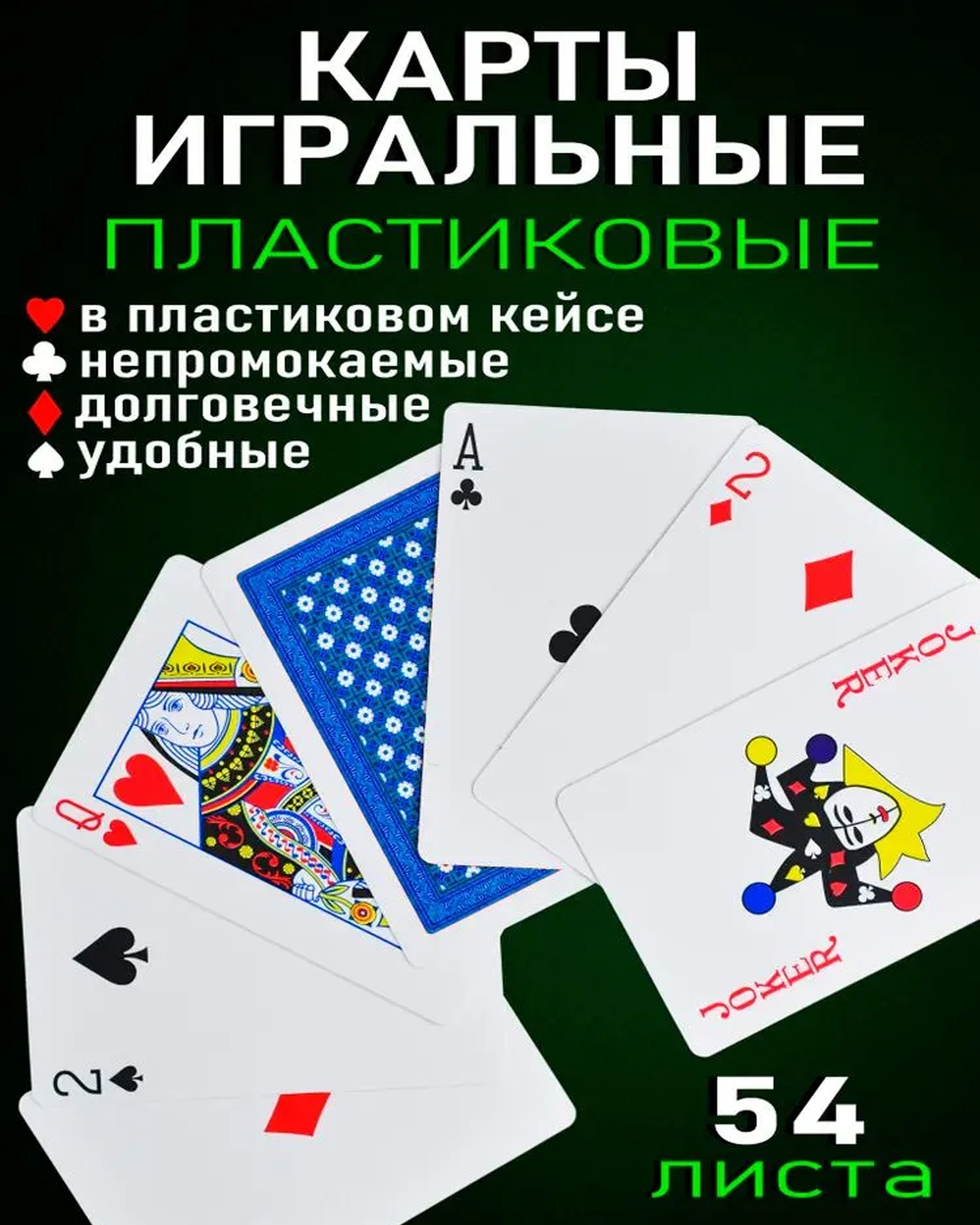 Карты выполнены из 100% пластика - они очень износостойкие, прочные, гибкие и приятные на ощупь. Карты удобно держать в руках, перемешивать и раздавать.