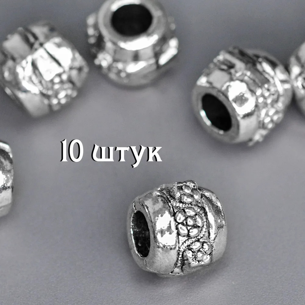 - Форма (вид) бусины: серебристая бусина с орнаментом (узором) в виде цветочков";