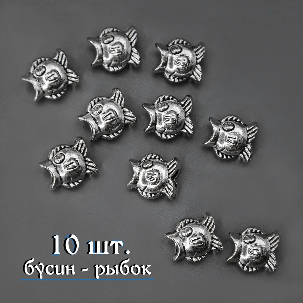 - Форма (вид) бусины: серебристая рыбка; - Комплект представляет собой набор из 10 бусин; - Диаметр отверстия: 5 мм; - Размер 1 бусины: длина 14 мм х ширина 12 мм х высота 8 мм; - Средний вес 1 бусины: 2.20 гр; - Расположения отверстия: горизонтально; - Производство: Китай.