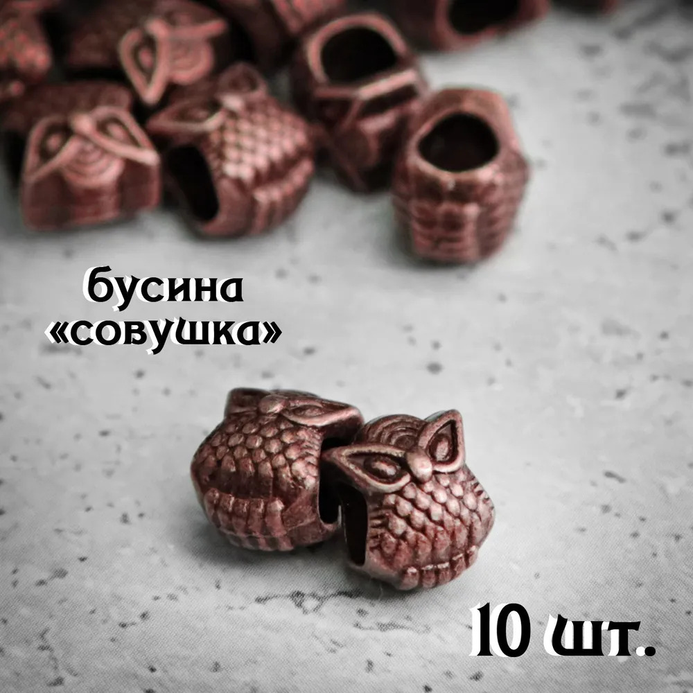 - Форма (вид) бусины: медная совушка; - Комплект представляет собой набор из 10 бусин; - Диаметр отверстия: 4 мм; - Размер бусины: длина 9 мм х ширина 8 мм х высота 8 мм; - Средний вес бусины: 1.57 грамма; - Расположения отверстия: горизонтально; - Производства: Китай.