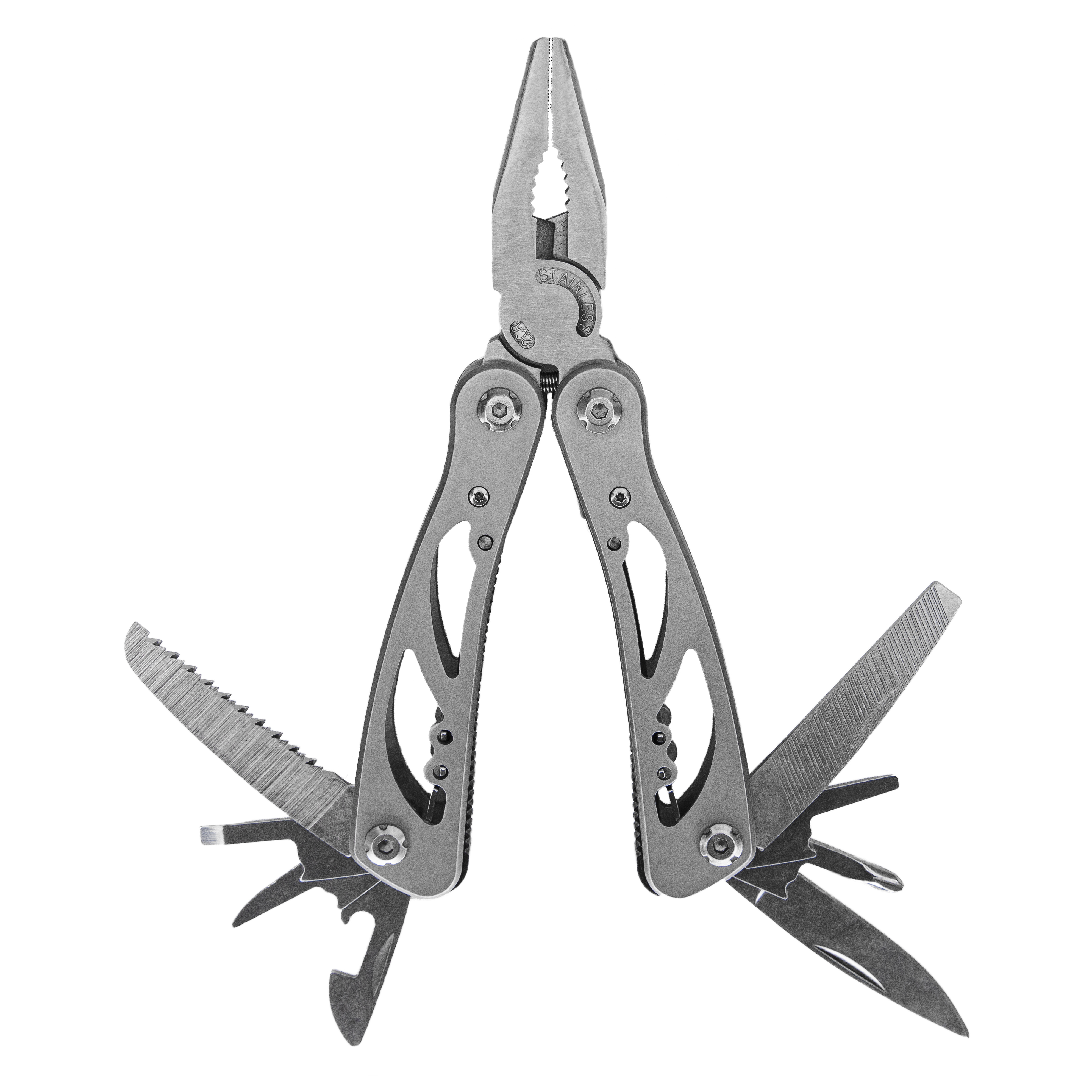 Список инструментов: плоскогубцы, кусачки, отвертки, лезвие, пилка, открывашка, зубчатый нож, шило, приспособление для зачистки кабеля.