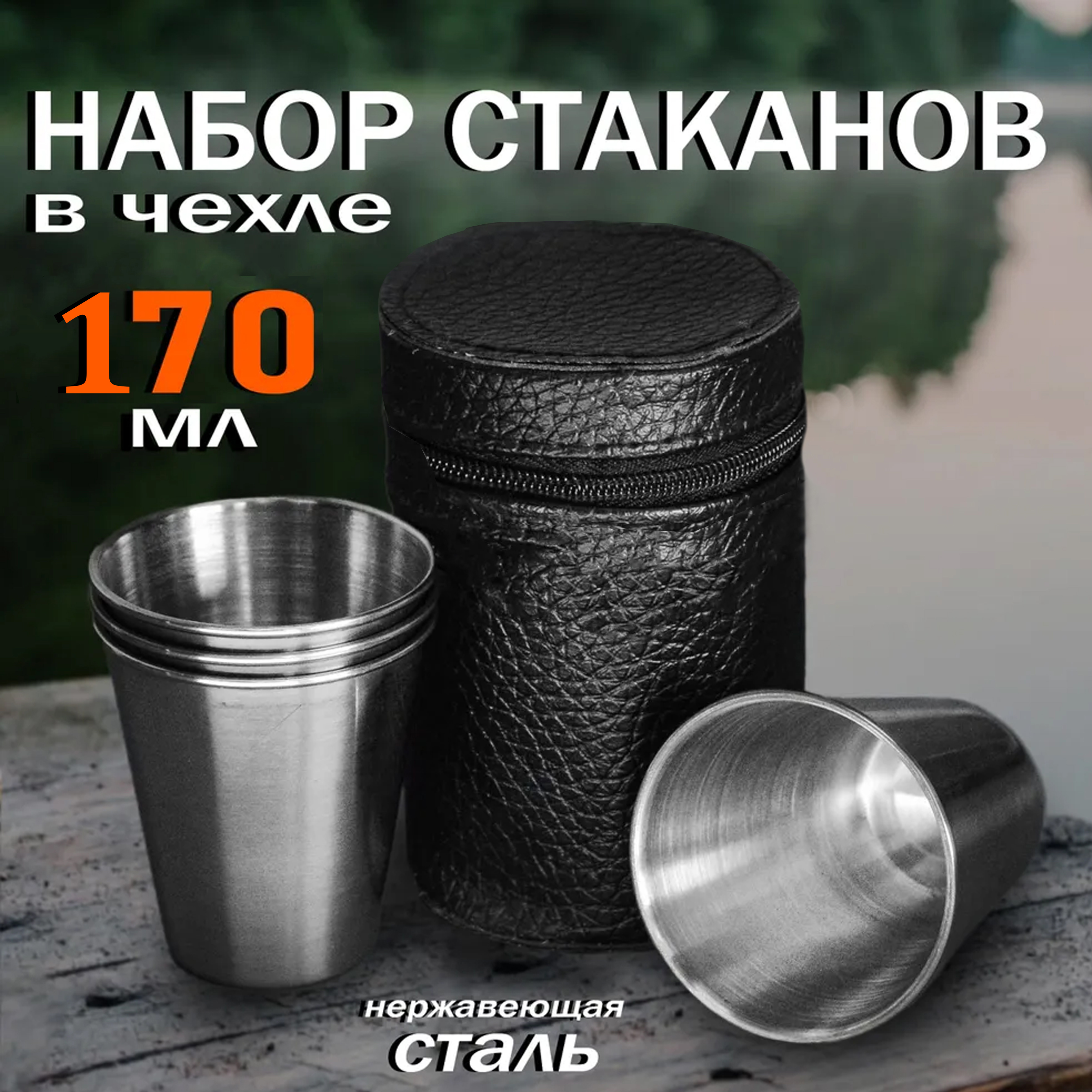 Набор стопок 4 шт 170 мл в чехле / Рюмки из нержавейки походные для туризма, пикника, рыбалки