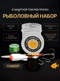 Рыболовный набор ПроНАЗ в защитной водонепроницаемой тубе IP68 (поплавок 1 шт.; Крючок №9 (15х9 мм): 2 шт.; Леска 11-13 метров; Грузила 2 гр.: 2 шт.; Блесна: 1 шт.);