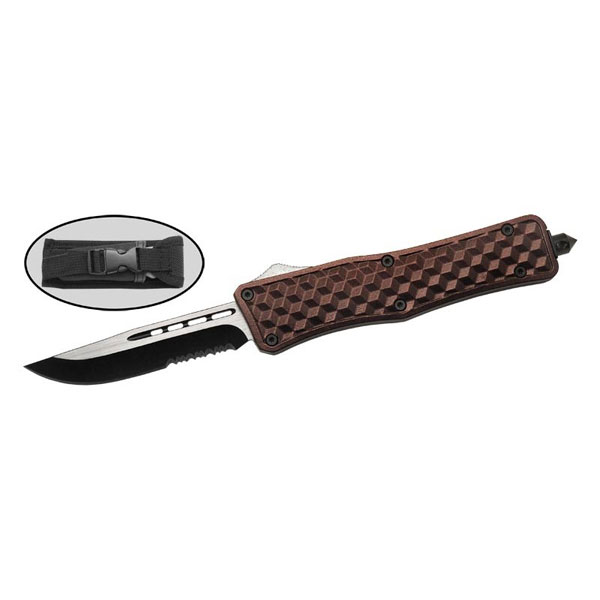 Автоматический складной нож с фронтальным выбросом клинка. Выброс обеспечивается кнопкой, расположенной на месте хвата рукоятки большим пальцем. После автоматического действия происходит надежная фиксация лезвия в рабочем положении. Клинок изготовлен из прочной стали 420. Рукоятка имеет практически прямую форму, металлическая. На ее задней стенке находится клипса, которая позволяет закреплять нож на ремне в любом положении.