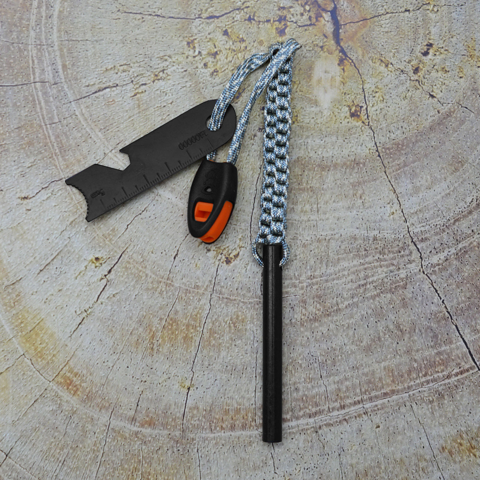 Стержень огнива выполнен из ферроцерия (сплав не менее чем из 7 редкоземельных металлов), в паре с кресалом из нержавеющей стали, обеспечивающее высечение искр, паракордом и свистком.