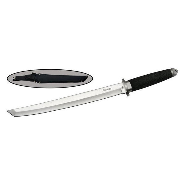Якудза выдержан в традиционном японском стиле. Клинок характерной формы сделан из прочной нержавеющей стали. Он хорошо рубит и колет, благодаря плавному изгибу лезвия прекрасно режет. Резиновая рукоять с рифлением удобна в работе, комфортно лежит в руке. Небольшая гарда в виде металлической пластины страхует пальцы от соскальзывания на лезвие и дает необходимый упор большому пальцу. Несмотря на суровый, военный облик, Якудза отлично справляется и с любой бытовой работой. Например им часто подрезают кусты и ветки, потому что здесь центр тяжести не так сильно смещен к острию как у мачете. Нож комплектуется удобными ножнами.
