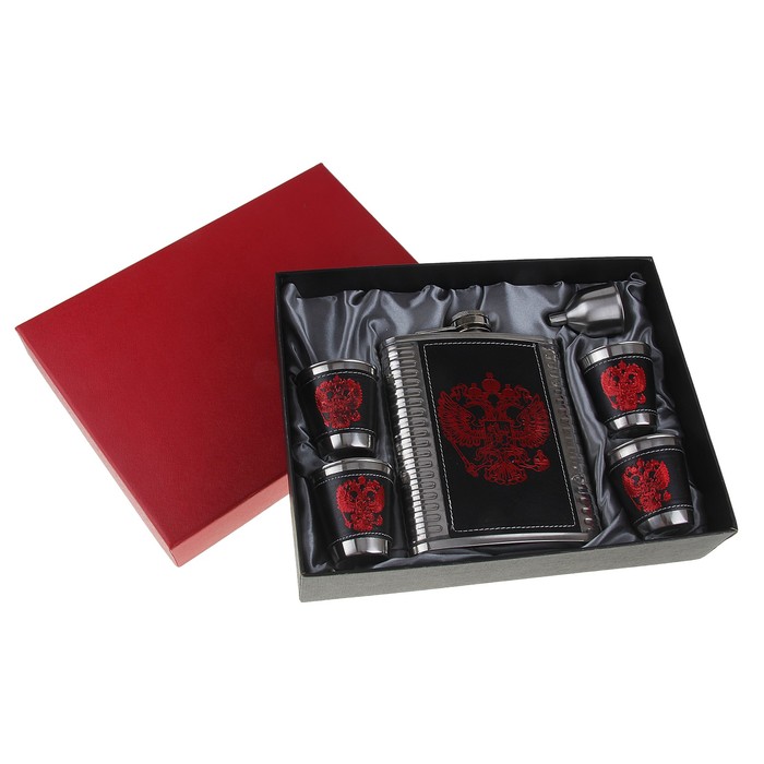 Практичная и стильная фляжка дополняется набором из четырех рюмок и воронкой. Важная особенность набора – только качественные, сертифицированные материалы. Нержавеющая сталь и качественный кожзам позволяют гарантировать высокую стойкость к износу, позволяя набору сохранять свою первозданную красоту в течение длительного срока службы. Стильный подарочный бокс делает набор универсальным презентом для своих близких, коллег и знакомых.