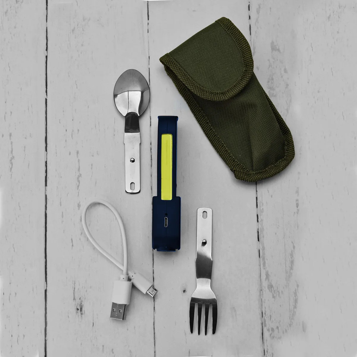 Незаменимый походный набор включающий в себя: вилка ложка беспламенная спиральная USB зажигалка лазер боковой фонарик Набор выполнен из высококачественной нержавеющей стали, упакованный в специальный чехол