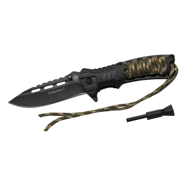 Производитель- Мастер Клинок Страна- КНР Oбщая длина- 213 мм Длина клинка- 93 мм Толщина клинка- 3 Сталь- 420, Рукоять- пластик, обмотка паракорд Чехол- нет
