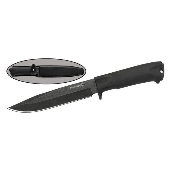 Нож Милитари станет отличным помощником всем тем, чья работа связана с возможностью оказаться в экстремальной ситуации. Клинок имеет форму с небольшим понижением обуха по направлению к кончику. От середины обуха начинается фальшлезвие. Клинок имеет общее сужение по направлению к кончику и высокие спуски от середины. Клинок сплошной, проходит через всю рукоять. В заднике ножа, клинок выступает, образуя ударное навершие с темлячным отверстием. Благодаря особой форме клинка, нож отлично приспособлен для совершения колющих и режущих движений. Упор второй руки на окончание рукояти, обеспечивает максимальное усилие на кончике ножа. Клинок имеет черное матовое покрытие, благодаря чему не бликует на солнце. Рукоятка ножа выполнена из эластрона и имеет эргономичную форму. Рукоять имеет небольшие ограничители для безопасного удержания ножа и защиты руки от соскальзывания в процессе работы. Нож укомплектован ножнами из качественной кожи. Ножны украшены изображением орла, который побеждает змею.
