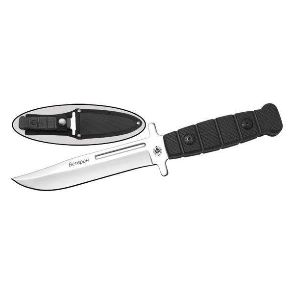 Надежный и простой нож туриста, путешественника, охотника. Он смонтирован по принципу full tang , с накладками из твердого пластика на стальной пластине. Это самый прочный вид монтажа, обеспечивающий надежность инструмента. Нержавеющая сталь отличается высокой сопротивляемостью к коррозии, хорошо держит заточку. Выступы в основании клинка образуют двустороннюю гарду. Ветеран в полной мере оправдывает свое название, он не поразит вас уникальным дизайном и космическими материалами. Это просто добротный и проверенный нож для тяжелой работы. Комплектуется удобными ножнами.