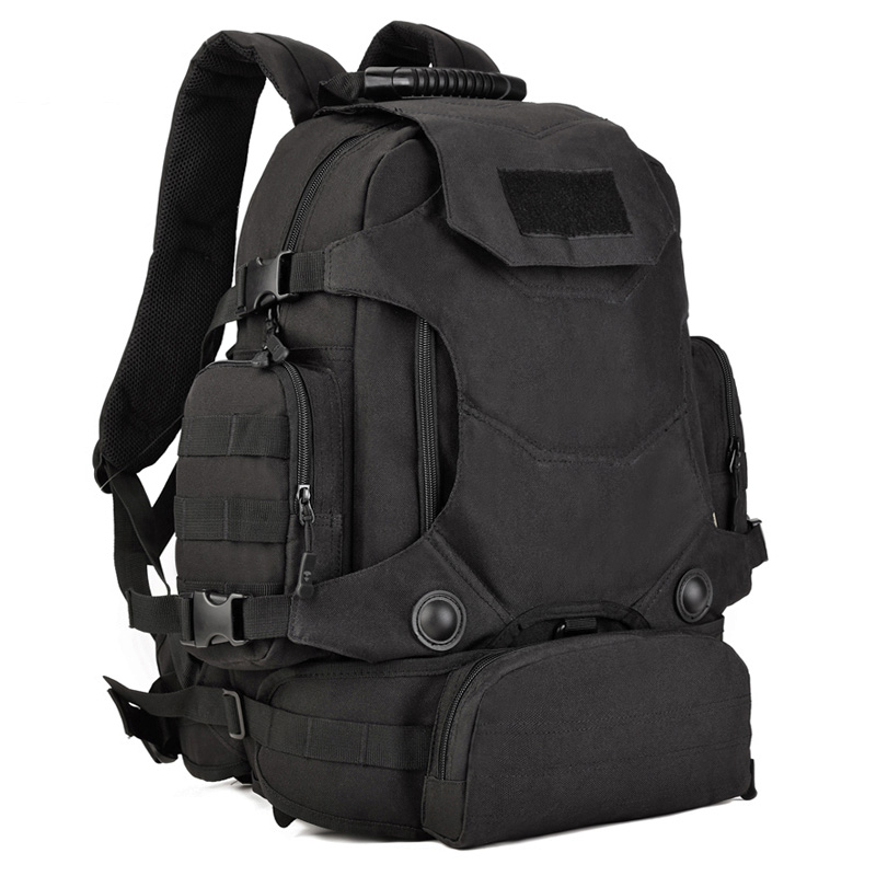 • Особенности строения: Спереди на рюкзаке - защитная накладка, которая крепится на карабины, и застегивается сверху на клапан, с нашитой на него ворсовой тканью для шевронов и т.д. Под накладкой находится отделение 35х25 см с двумя карманами 14х14 см. Спереди на уровне пояса у рюкзака есть пристегной карман 22х10х15 см с нашитыми стропами. По бокам рюкзака- два кармана 20х4х11 см. Основное большое отделение размером 43х35х15 см, в нем карман 25х30 см. Спинка рюкзака и лямки, со стороны прилегающей к телу, прошиты поролоном и тканью-сеткой, которые обеспечат максимальный комфорт. На лямках есть стропы для навешивания дополнительных аксессуаров. Для переноски рюкзака в одной руке есть ручка с прорезиненным покрытием.