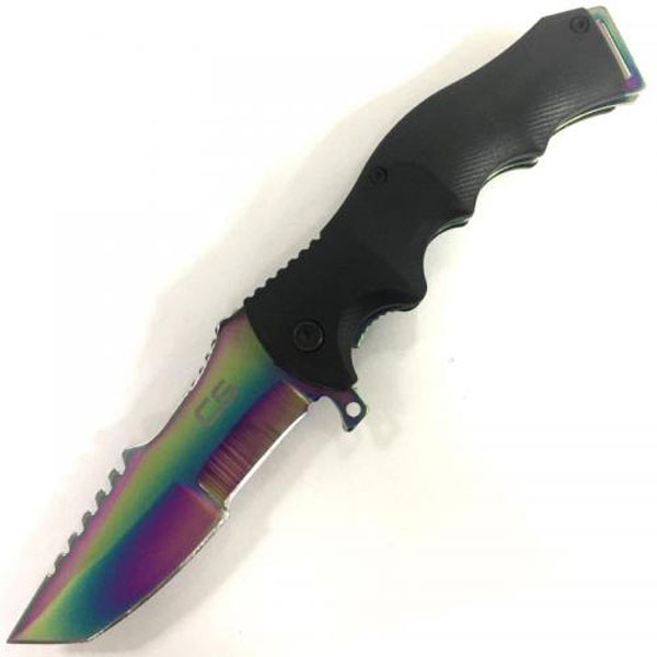 Нож сделан по мотивам компьютерной игры Counter-Strike.Выполнен в яркой расцветке градиент.Рукоять сделана из пластика, что облегчает общий вес ножа.На обухе и рукоятке есть насечки для упора большого пальца руки.Открывается нож при помощи плавника.Для ношения на кармане одежды предусмотрено крепление-клипса.На тыльной части рукоятки ножа есть разъем под ремешок или темляк.