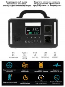Интерфейс зарядки (вход): порт внешнего зарядного устройства от сети 220В и порт зарядки солнечной панели DC5521х1 (встроенный интеллектуальный контроллер солнечной энергии);