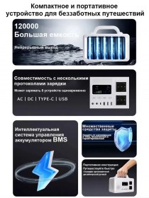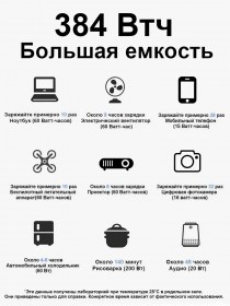Емкость аккумулятора: При 220В-192ВЧ, При 110В-384ВЧ, 120000мАч при 5В1А;