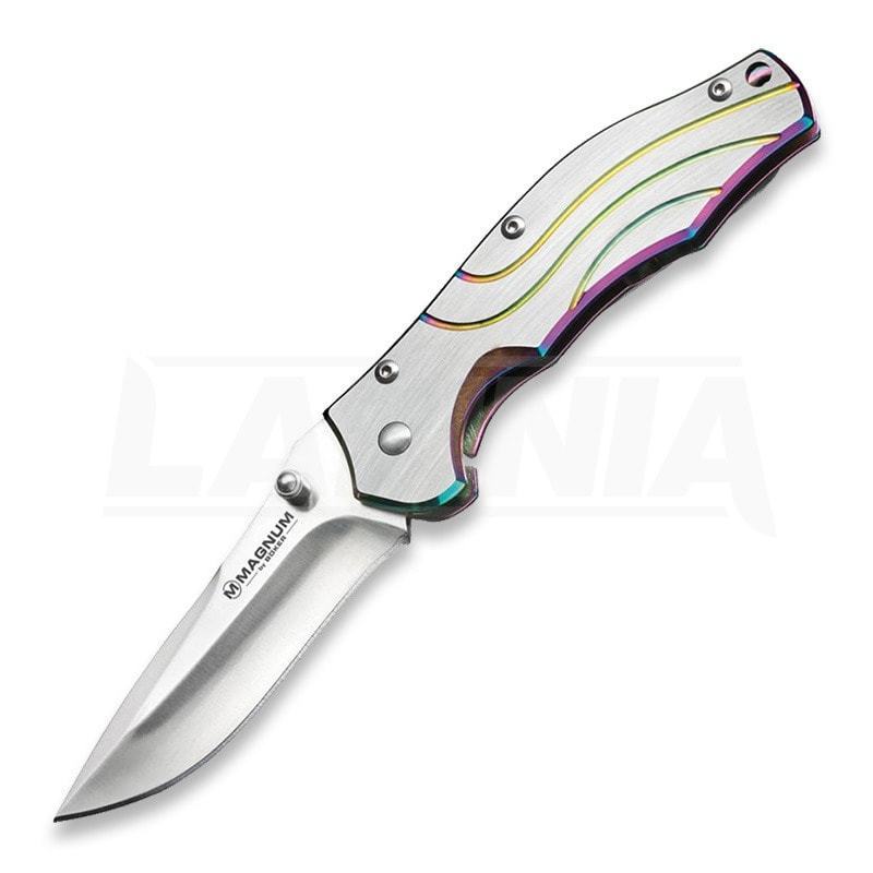 Этот нож среднего размера не только имеет чрезвычайно элегантный внешний вид, но и является очень полезным повседневным помощником. Стальное лезвие 440A входит в зацепление с рамным замком, который является частью рукоятки из нержавеющей стали. По краям рукояти чешуйки и декоративные канавки выполнены в сдержанных радужных тонах. Включает в себя глубокий зажим для переноски и отверстие для шнурка.