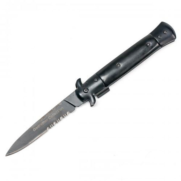 Сама же рукоятка сделана из пластиковых накладок с металлическими вставками. Для открытия ножа используют рычаг, который является частью клинка выступающей в сторону. Резким движением нужно потянуть плавник на себя и нож раскроется. В этой модели лезвие оснащено серейтером для разрезания веревок, кусков ткани и т.п. Фиксацию клинка обеспечивает механизм замка типа Liner-Lock.