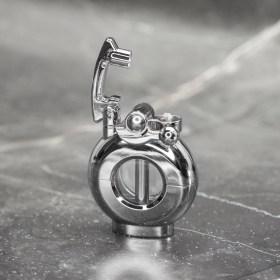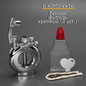 Стильная бензиновая автоматическая зажигалка. Выполнена в современном стиле, с прозрачным резервуаром для жидкого топлива. В комплекте с зажигалкой идет: пластмассовая фирменная бутылочка с бензином, специальный ключик для открытия емкости для дозаправки, фитиль (1 шт.), кремний (2 штуки). Данные предметы располагаются в коробке под зажигалкой.