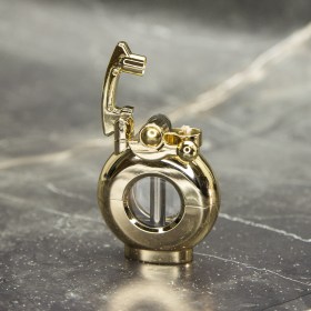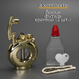 Стильная бензиновая автоматическая зажигалка. Выполнена в современном стиле, с прозрачным резервуаром для жидкого топлива. В комплекте с зажигалкой идет: пластмассовая фирменная бутылочка с бензином, специальный ключик для открытия емкости для дозаправки, фитиль, кремний (2 штуки). Данные предметы располагаются в коробке под зажигалкой.