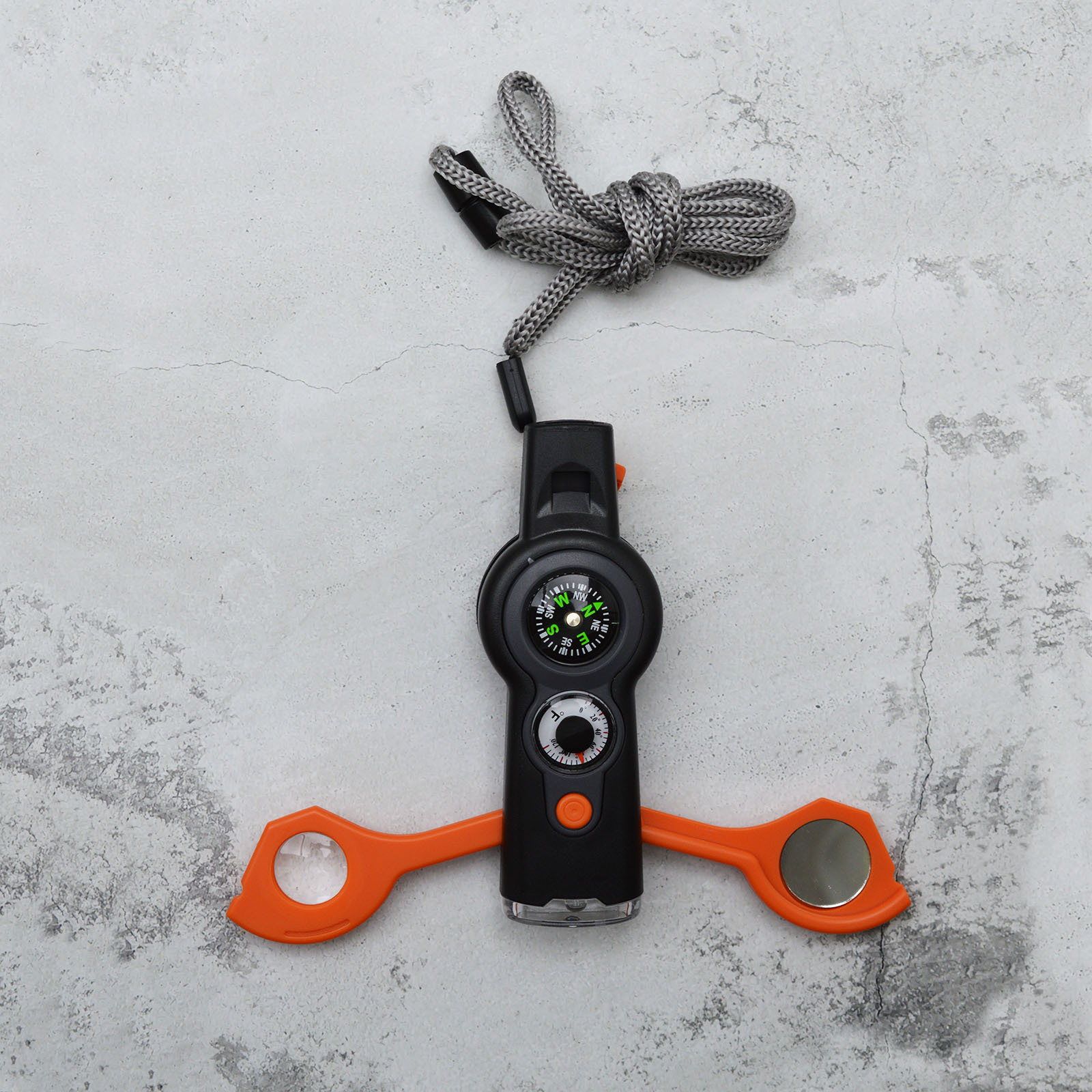 Свисток для выживания компас, термометр, фонарь, зеркало, увеличительное стекло и отсек для спичек.