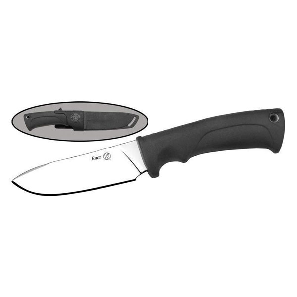 Название модели - Енот Общая длина (мм) - 230 Длина клинка (мм) - 106 Ширина клинка (мм) - 32 Толщина обуха (мм) - 4,6 Материал рукояти - Эластрон Форма клинка - Classic blade Твердость клинка (HRC) - 57-59 Сталь - AUS-8 Конструкция - Черен напрессован на хвостовик, идущий по всей длине рукояти с фиксацией через темлячное отверстие Спуски - Вогнутые (вогнутая линза) от обуха Чехол/ ножны - Поясные из натуральной кожи Вес (гр) - 255 Особенности: Обработка клинка - Полированный